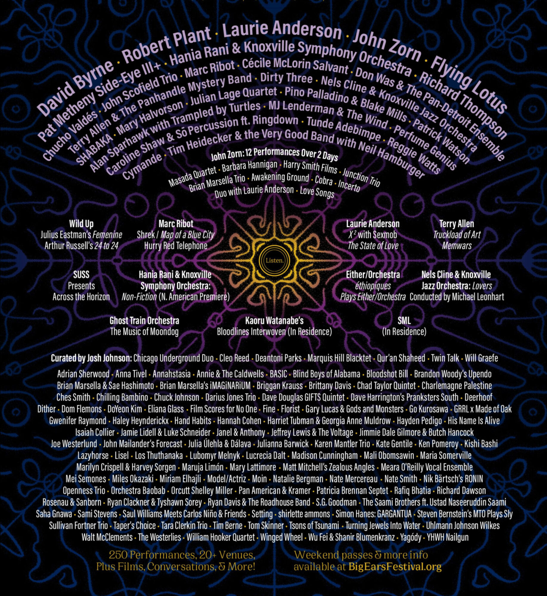 BIG EARS just released the 2026 lineup today, and it’s another doozy. You can’t miss names like David Byrne, Laurie Anderson, and Robert Plant in the large font up top, but the lineups for this festival are nothing if not deep. No matter how many times I look at the list of artists, I always notice something amazing that I’ve overlooked. This continued last year during the festival itself. Some of the standouts hidden within the belly of this beast are Dirty Three, MJ Lenderman, Hayden Pedigo, Mary Lattimore, BASIC, Tom Skinner, Taper’s Choice, Orcut Shelly Miller, Cymande, and Go Kurosawa, and those are just a selection of the first names that jumped out right now as I scan over it. If I tried that again, I could find just as many equally exciting artists on this list. Another thing to keep in mind while viewing a Big Ears lineup is exactly what the artists are doing. For example, John Zorn isn’t just performing once, but actually 12 different times over 2 days with at least 10 different projects.