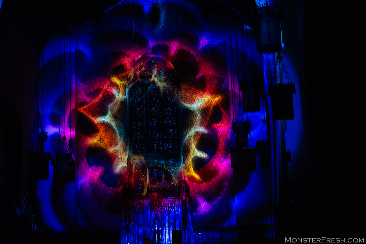 The way the shuttle dropped us off gave the impression that the cathedral was in a somewhat isolated location away from everything else. It was dark inside, but I could make out the silhouette of Steve Roach surrounded by synths and other less orthodox instrumentation. The ceiling reached up to the heavens, and there was an immaculate stained-glass window behind the electronic visionary. Sound undulated while abstract purples, teal, and amber projections shifted in and out of each other like a kaleidoscope. Engulfed by this morphing nebula, Roach would purposefully turn to a synth, then to a didgeridoo, allowing the sounds to fuse and resonate through the room. Textures rippled out like sonar and through my entire being on impact. It didn’t feel like a show as much as walking in on a ritual that wasn’t intended for onlookers. A ritual that was too far gone for him to care, because it was too late to stop it. And why would we? It was hypnotic. Why would we….?