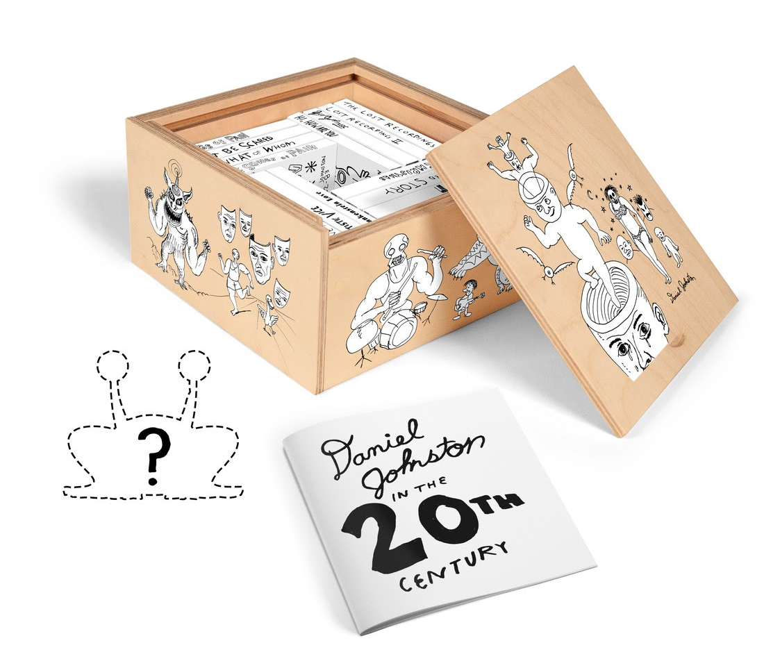 Today, the Daniel Johnston estate and Joyful Noise Recordings unveil Daniel Johnston ‘In the 20th Century.’ This limited edition cassette box combines 16 of Johnston‘s early albums for the first time in one set. The tapes are housed in a hand-crafted, screen-printed wooden box featuring Daniel‘s artwork. Included is an exclusive “mystery toy” produced by New York‘s Clutter Gallery in conjunction with Lunch Lady Studios. Clutter has an established relationship with Johnston‘s estate, having produced limited edition collectible vinyl figures of Daniel‘s iconic character, Jeremiah The Innocent, in the past.