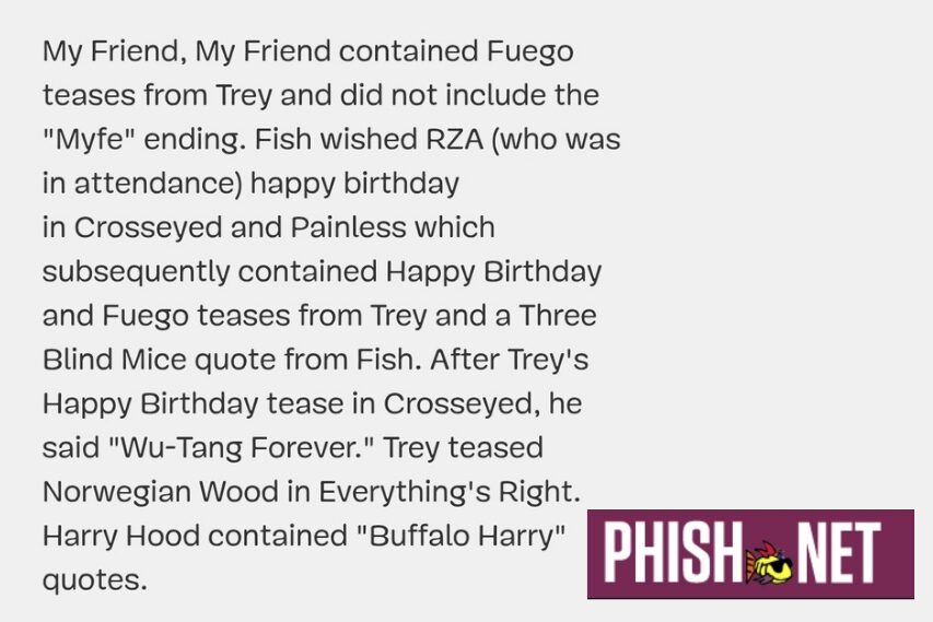According to sources like PHISH.net and Setlist FM (not my friends in attendance who should have texted me about it), drummer Jon Fishman wished RZA a happy birthday. Trey Anastasio did a guitar tease of the Happy Birthday song during their cover of the Talking Heads classic, “Crosseyed And Painless” and later called out “WU-TANG Forever!“